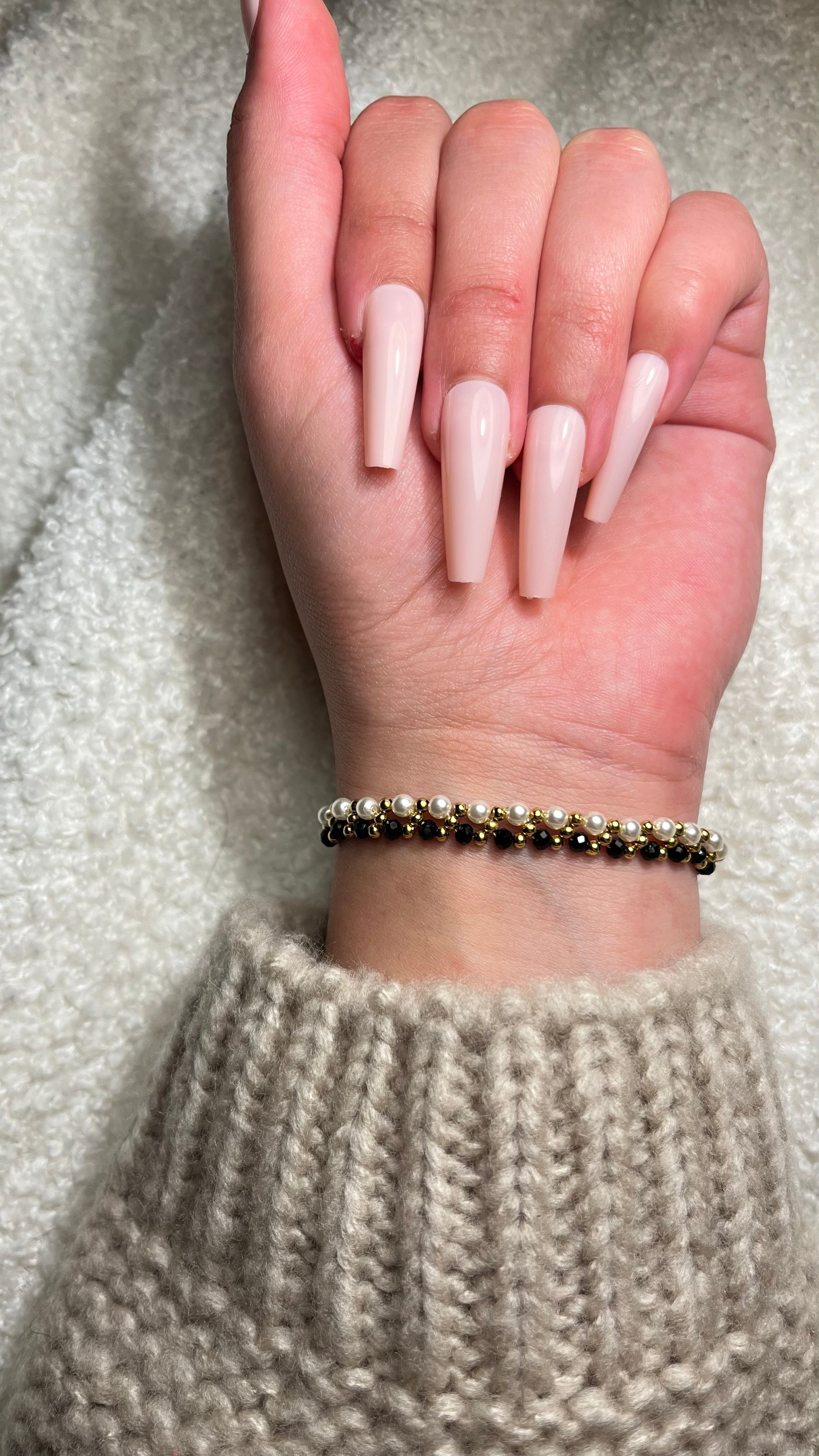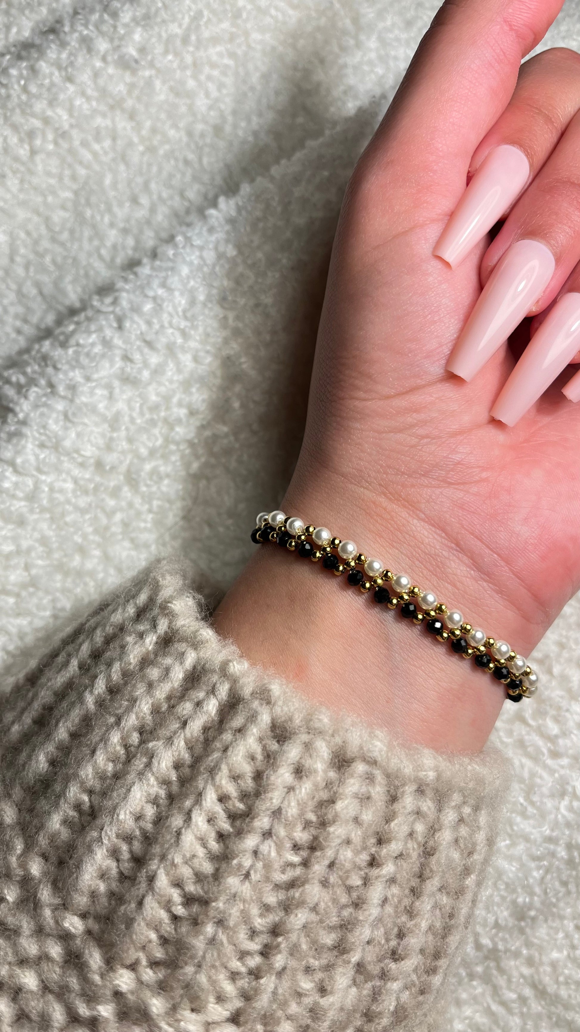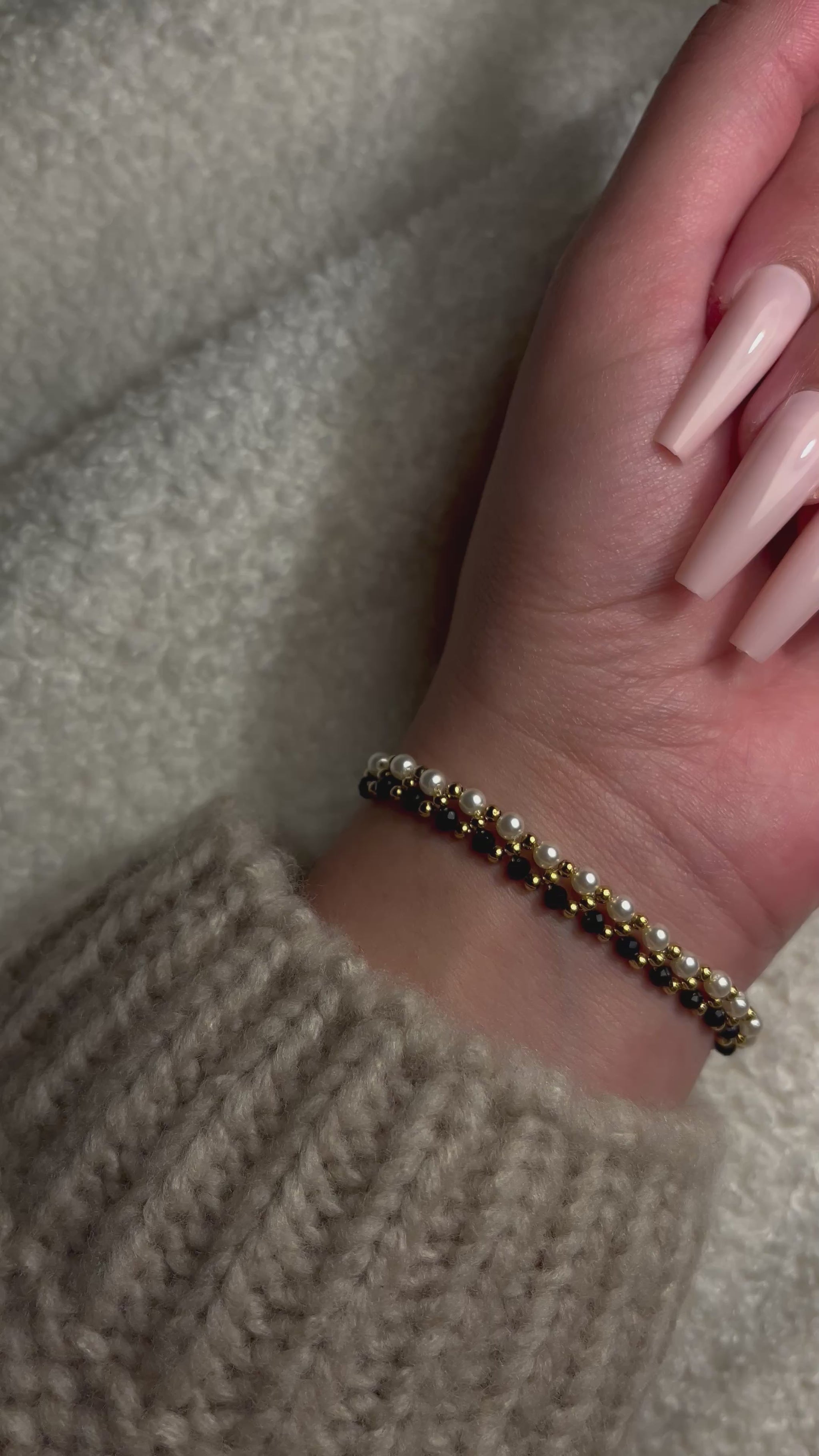 Bracelet en acier inoxydable de couleur doré avec des petites perles noir et blanches.