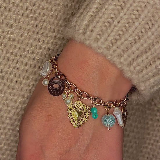 Bracelet breloque en acier inoxydable de couleur doré avec ses pendentifs.