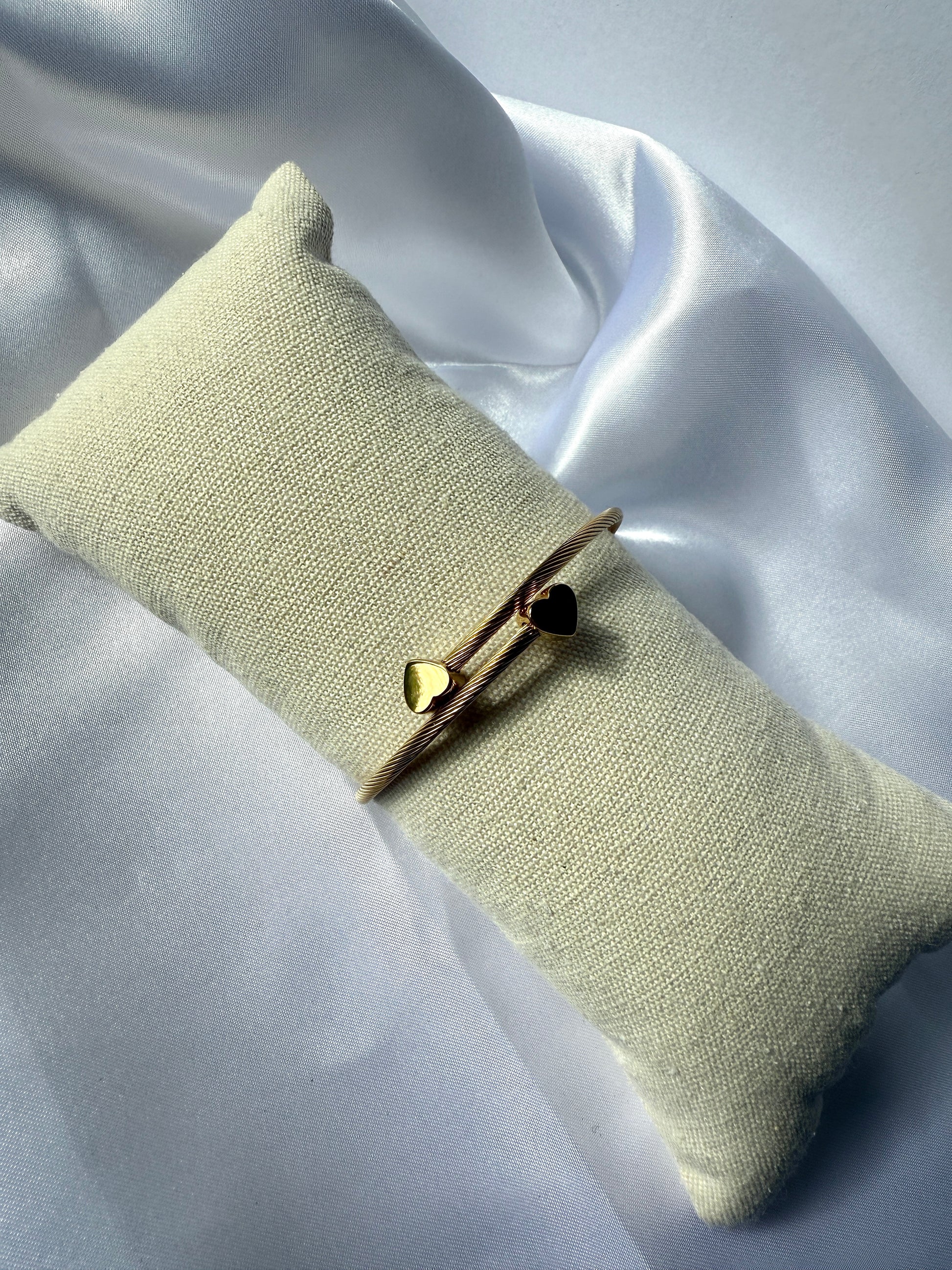 Bracelet ouvert avec deux petits cœurs aux extrémités, parfait pour un style romantique et doux.