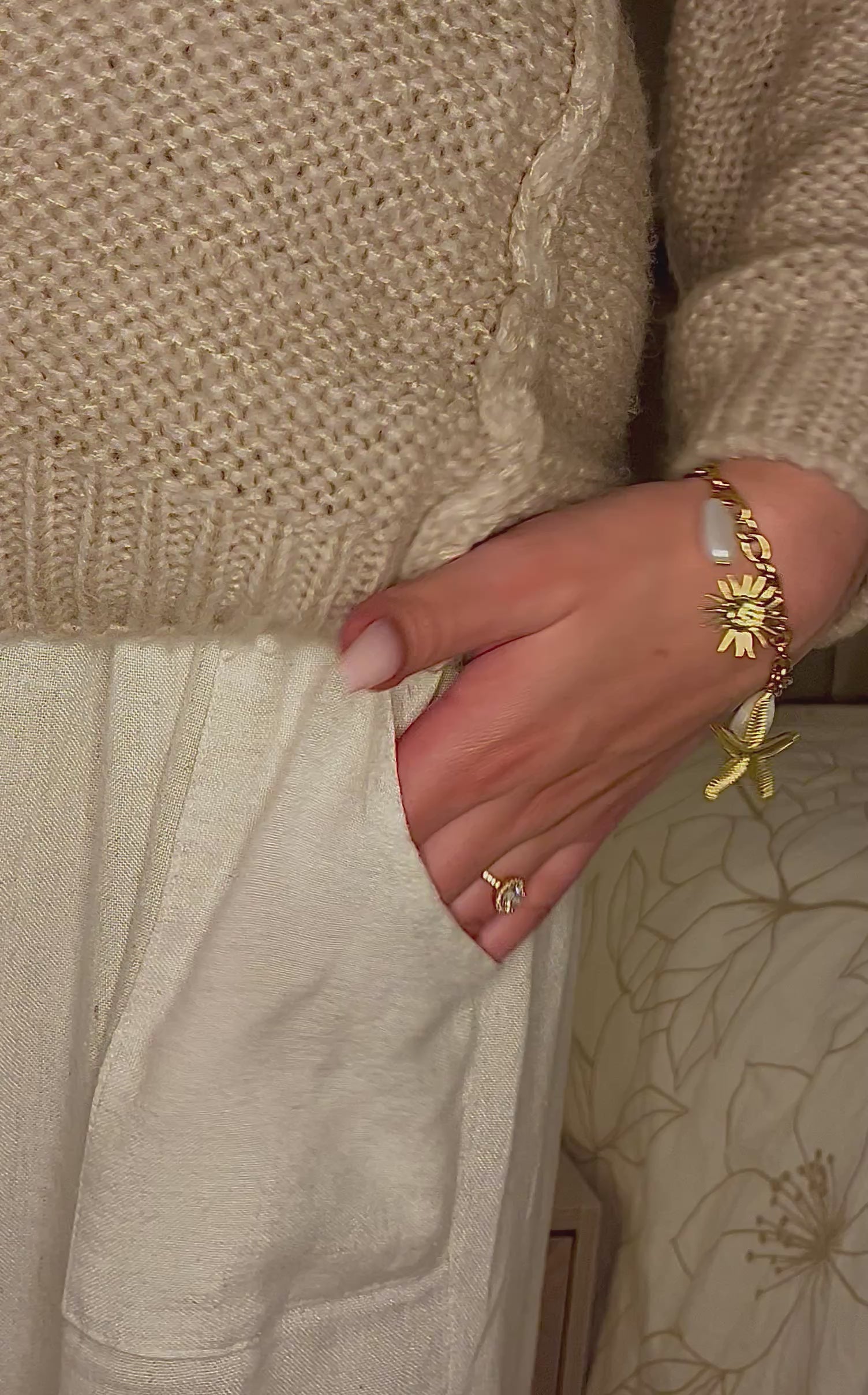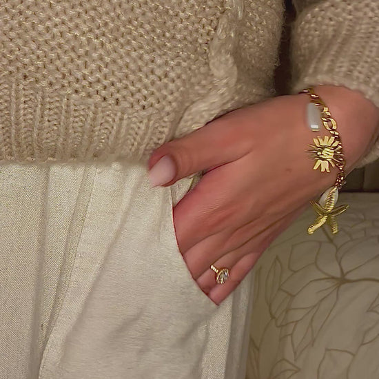 Bracelet breloque en acier inoxydable de couleur doré avec plusieurs pendentifs.