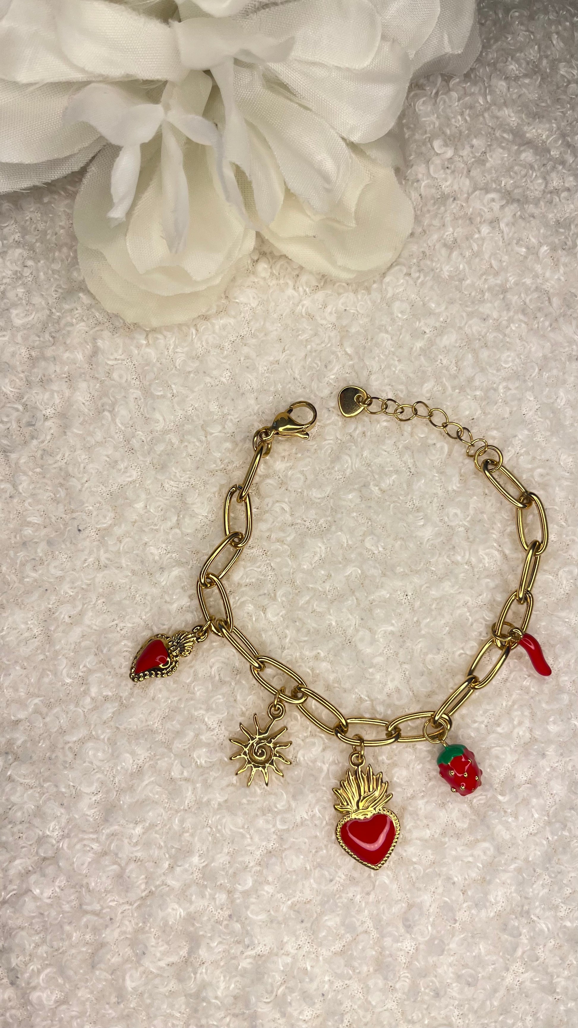 Bracelet breloque en acier inoxydable de couleur doré avec ses pendentifs.