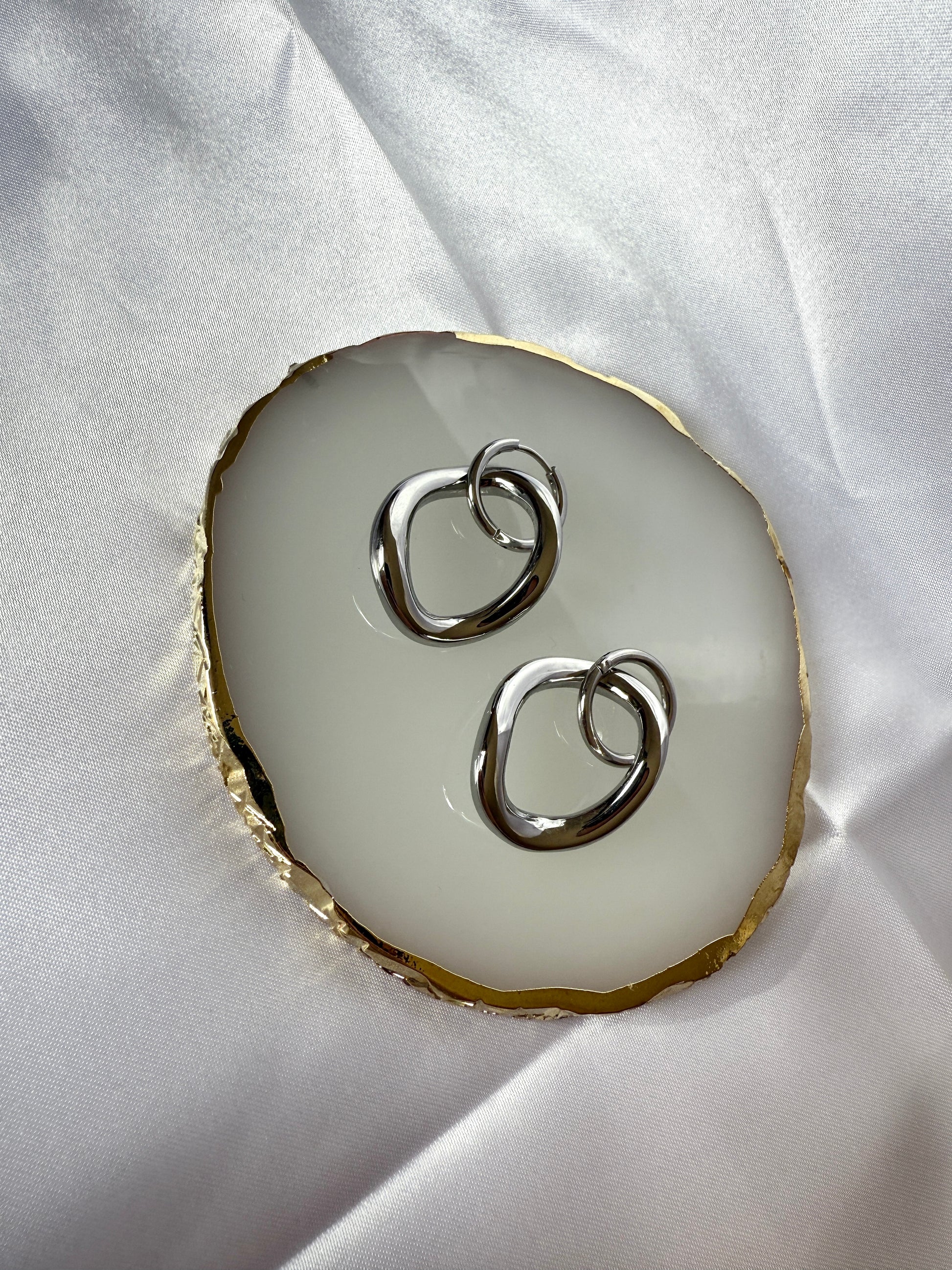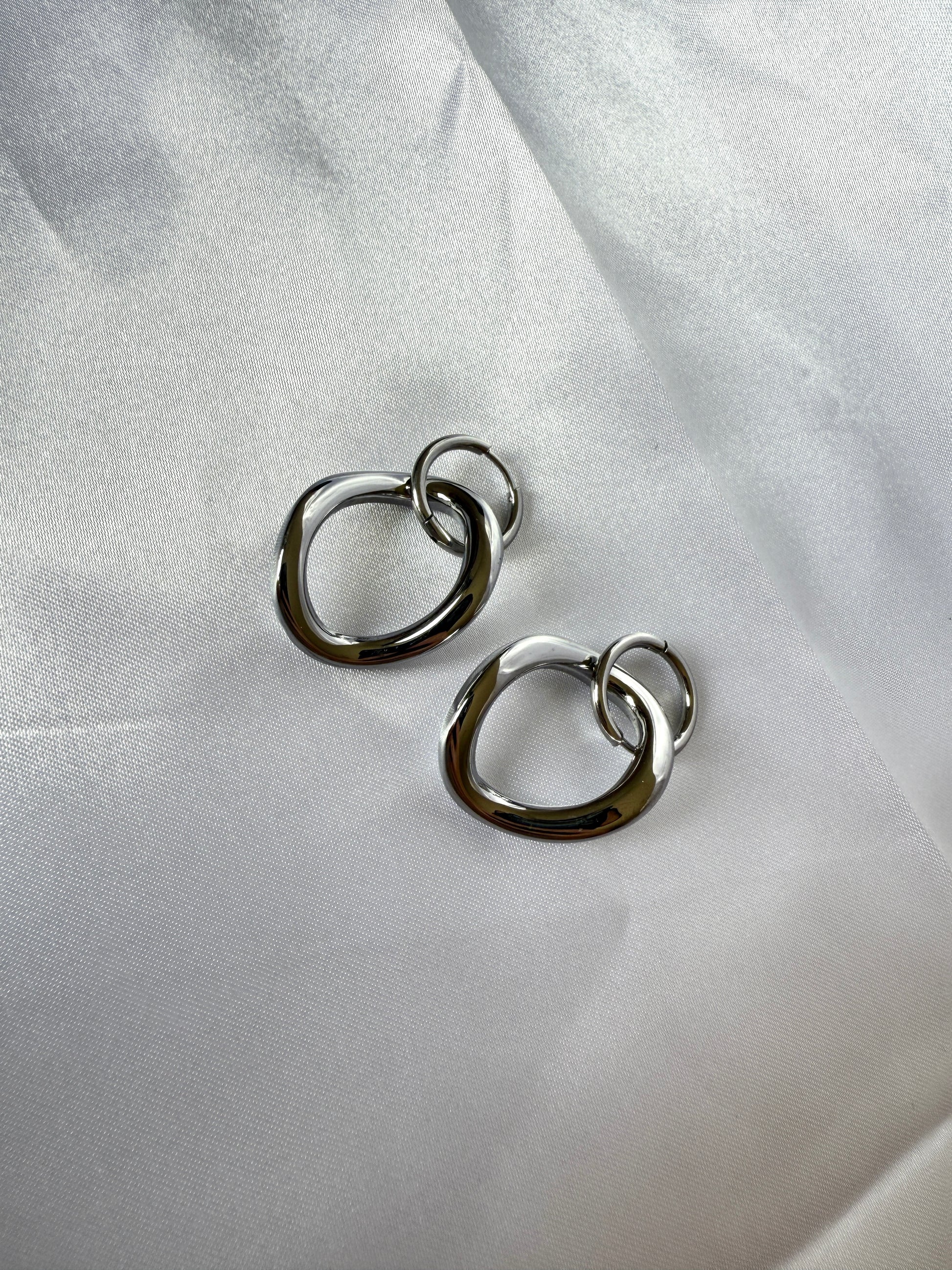 Boucles d’oreilles pendantes en acier inoxydable de couleur argenté, composées de cercles délicats rappelant de petites bulles suspendues.