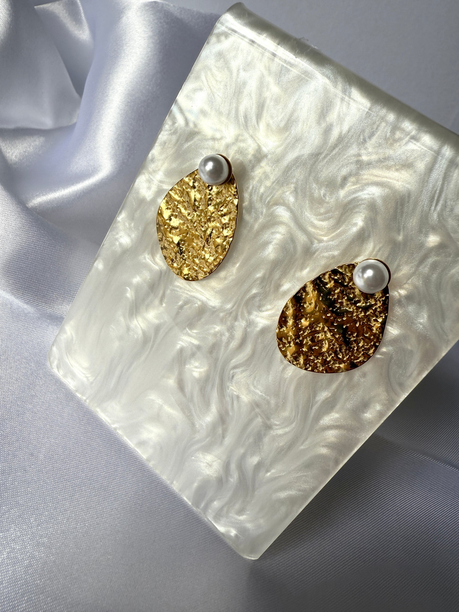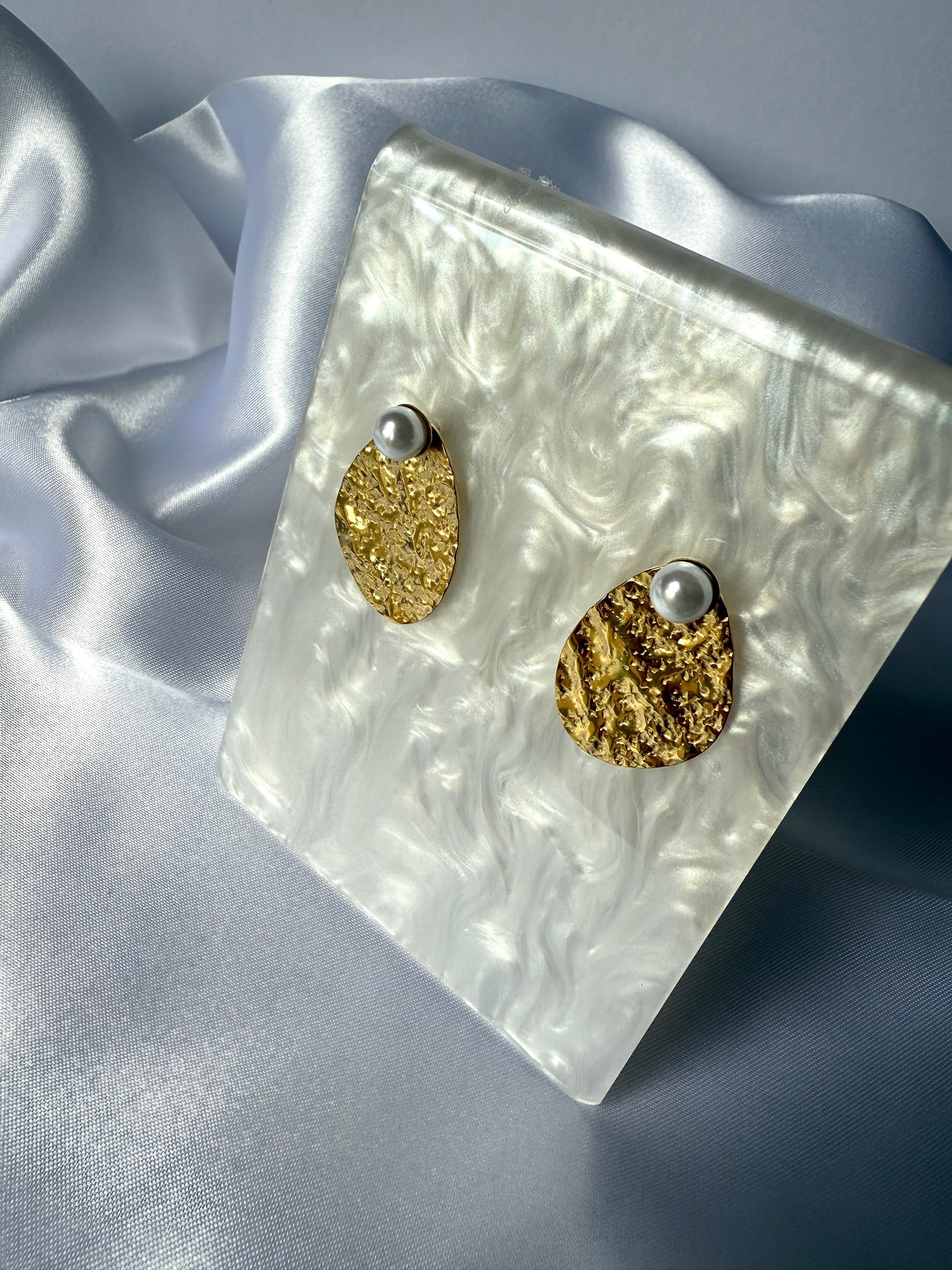 Boucles dorées martelées en forme de goutte, ornées d’une perle délicate. Un mélange raffiné entre modernité et chic classique.