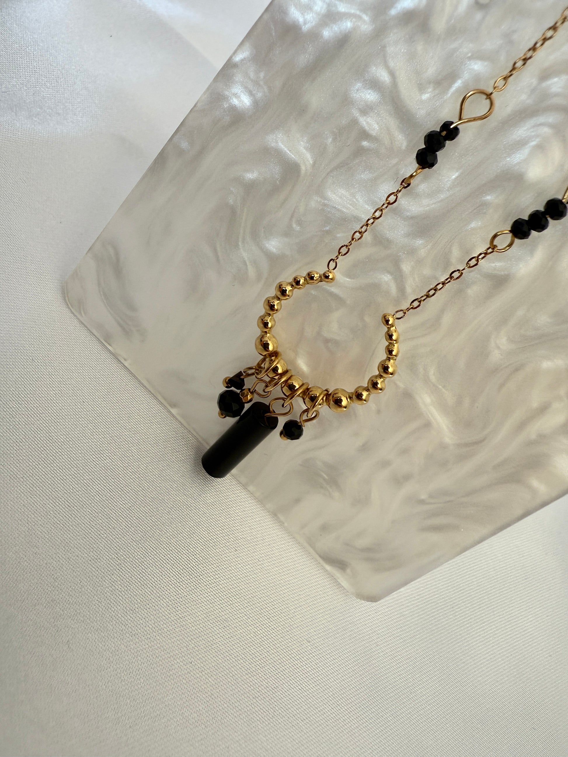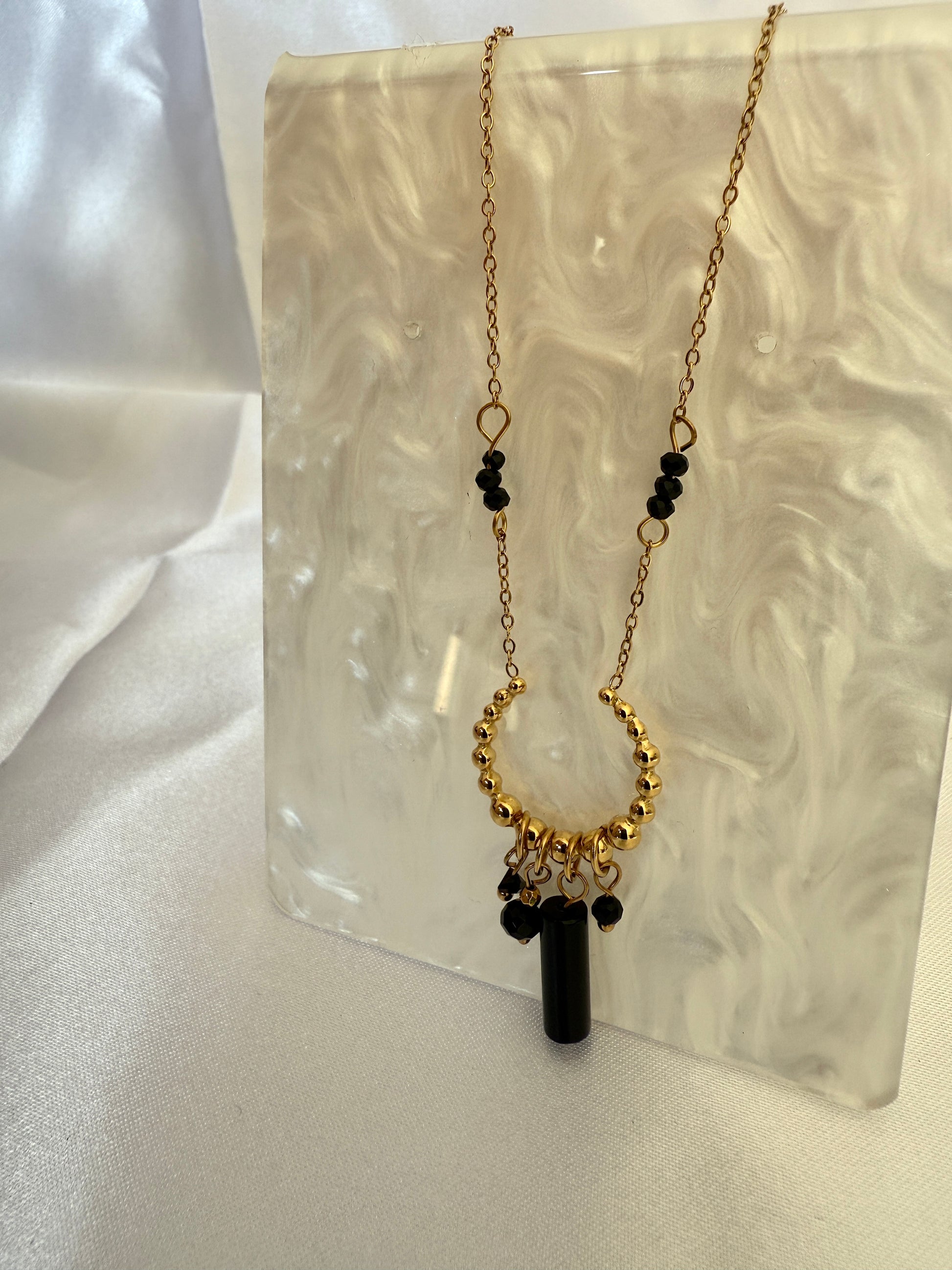 Collier doré avec pendentif orné de pierres noires, un style fort et audacieux.