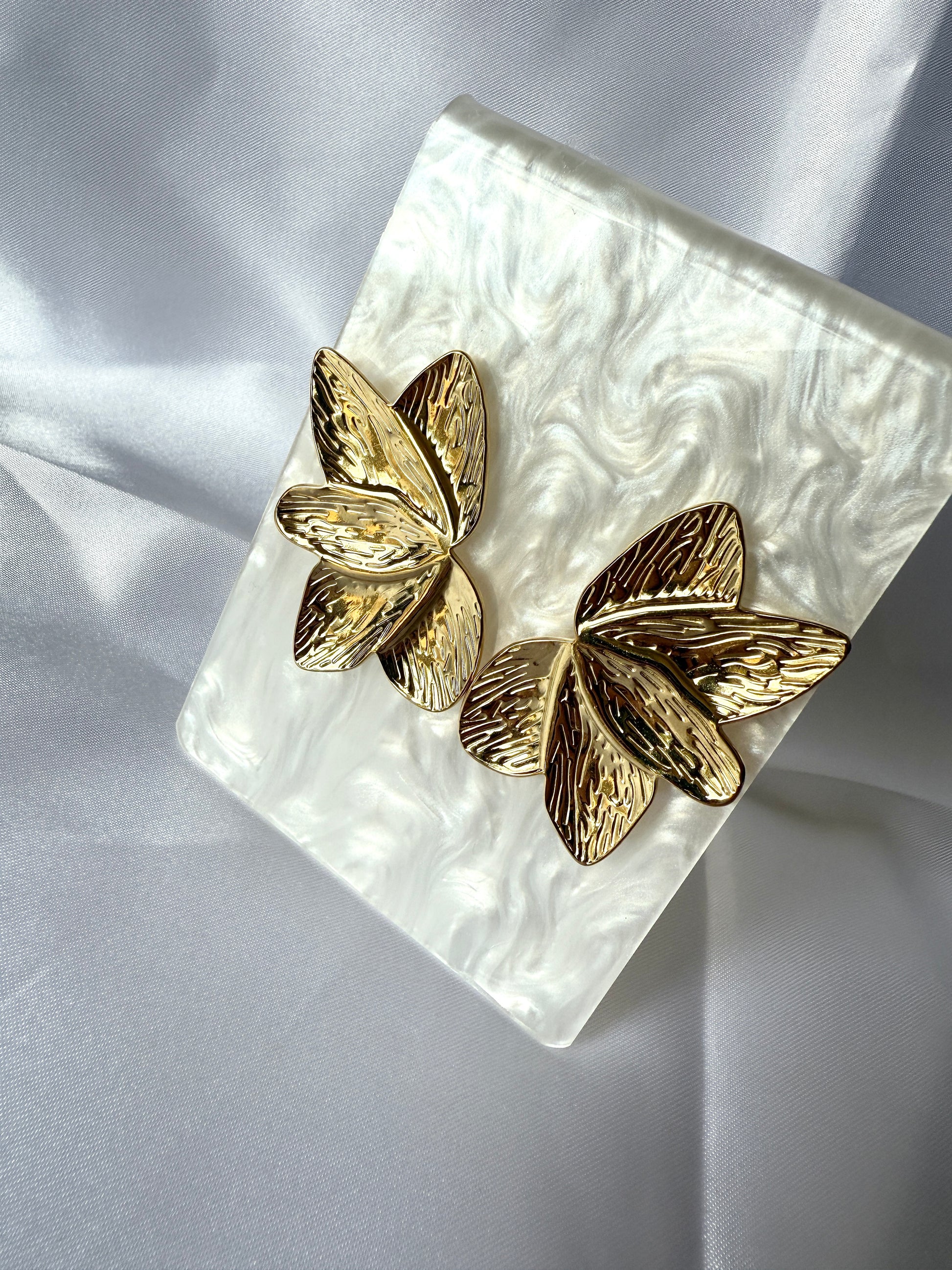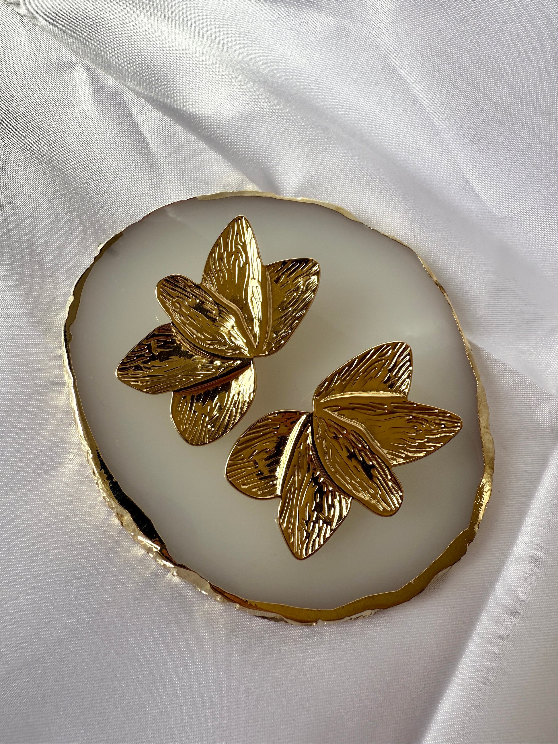 Boucles d’oreilles en acier inoxydable de couleur doré, en forme de demi feuilles délicates, rehaussées de petits traits évoquant la finesse des nervures des feuilles.