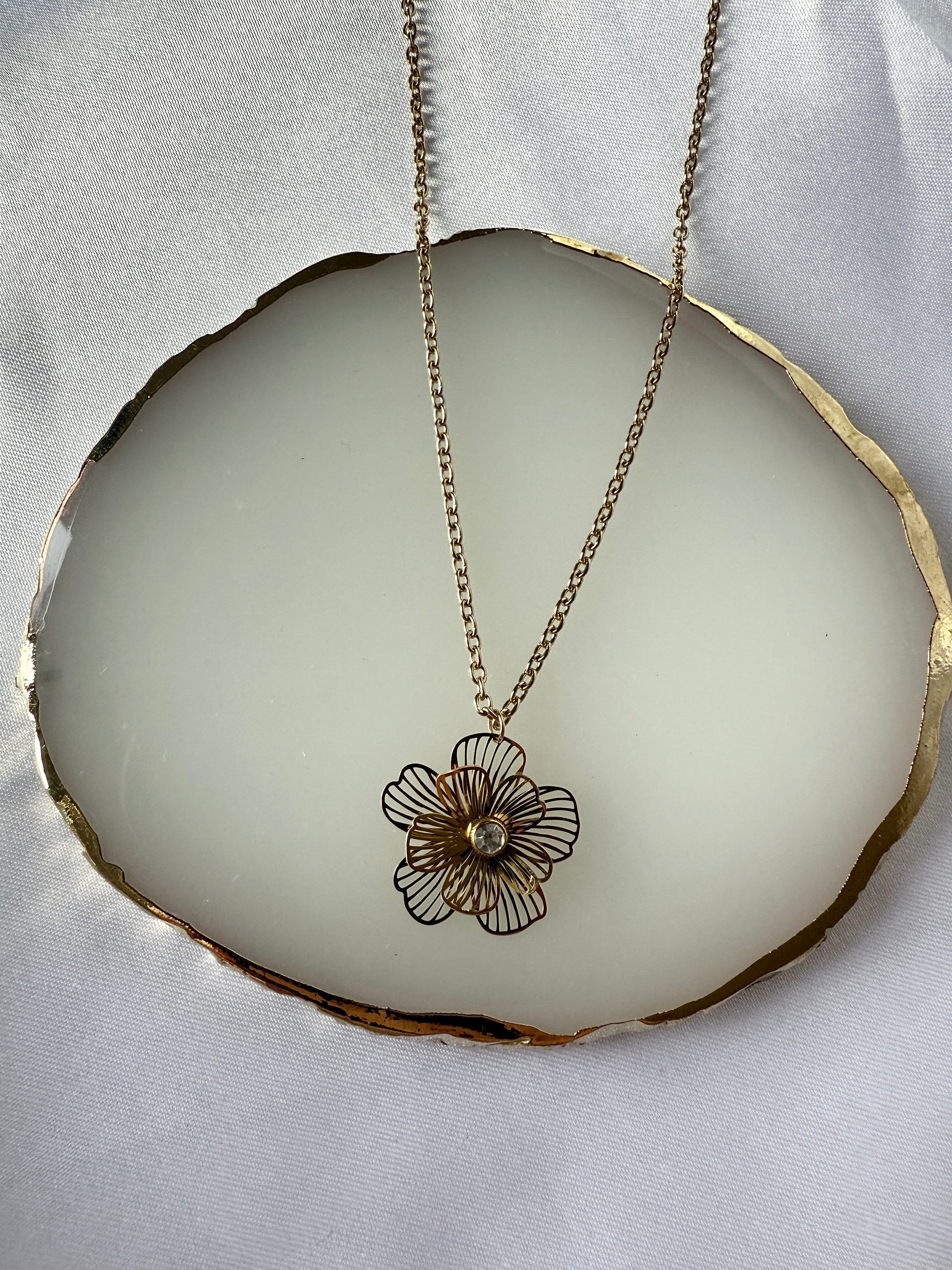 Collier en acier inoxydable de couleur doré, orné d’un pendentif en forme de fleur délicate, sublimée en son cœur par un diamant étincelant. Un bijou raffiné qui allie florale et éclat précieux.