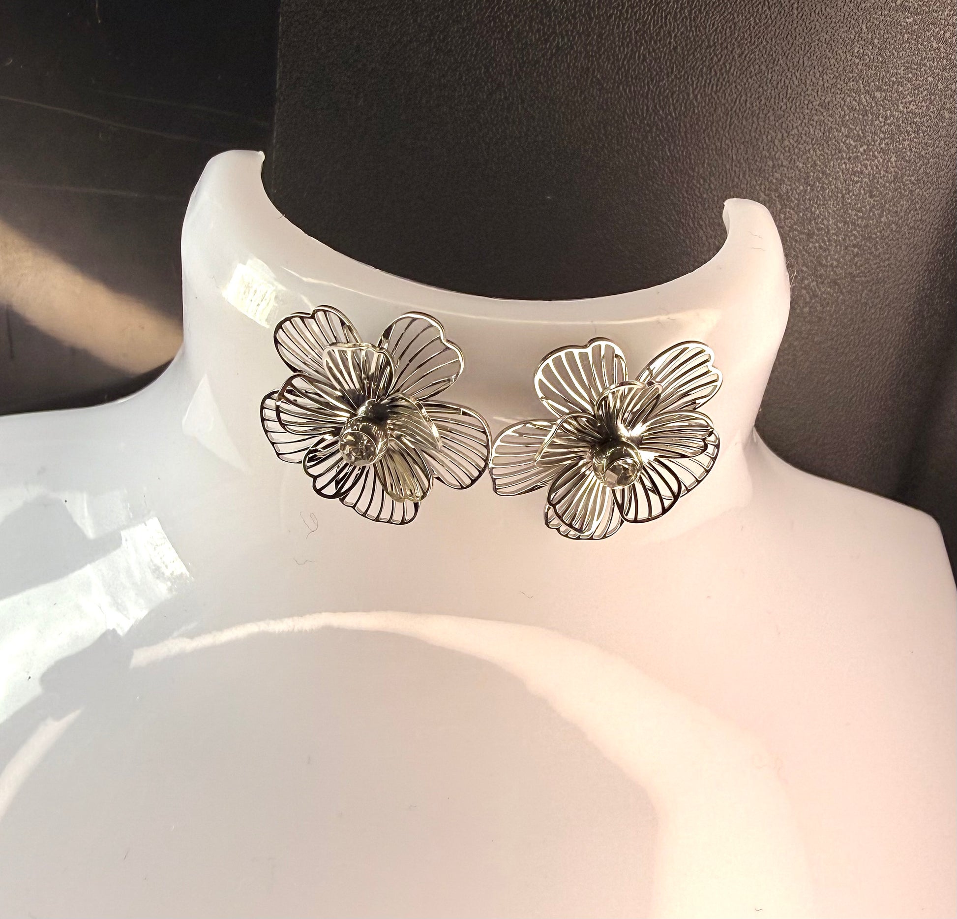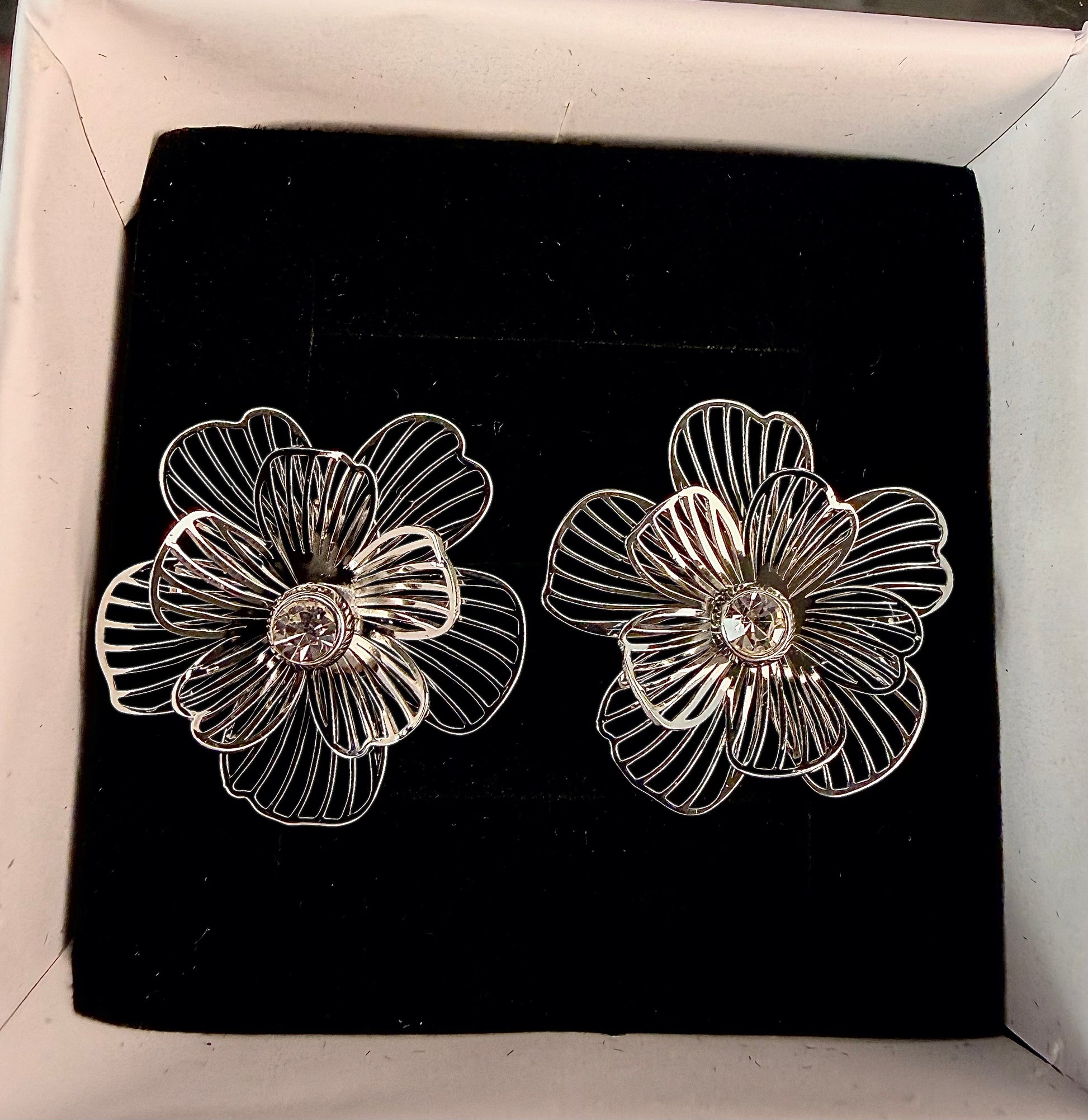 Boucles d’oreilles en acier inoxydable de couleur argenté, en fleurs 3D élégantes avec cinq pétales en dessous et cinq pétales au dessus, sublimées par un diamant scintillant au centre.