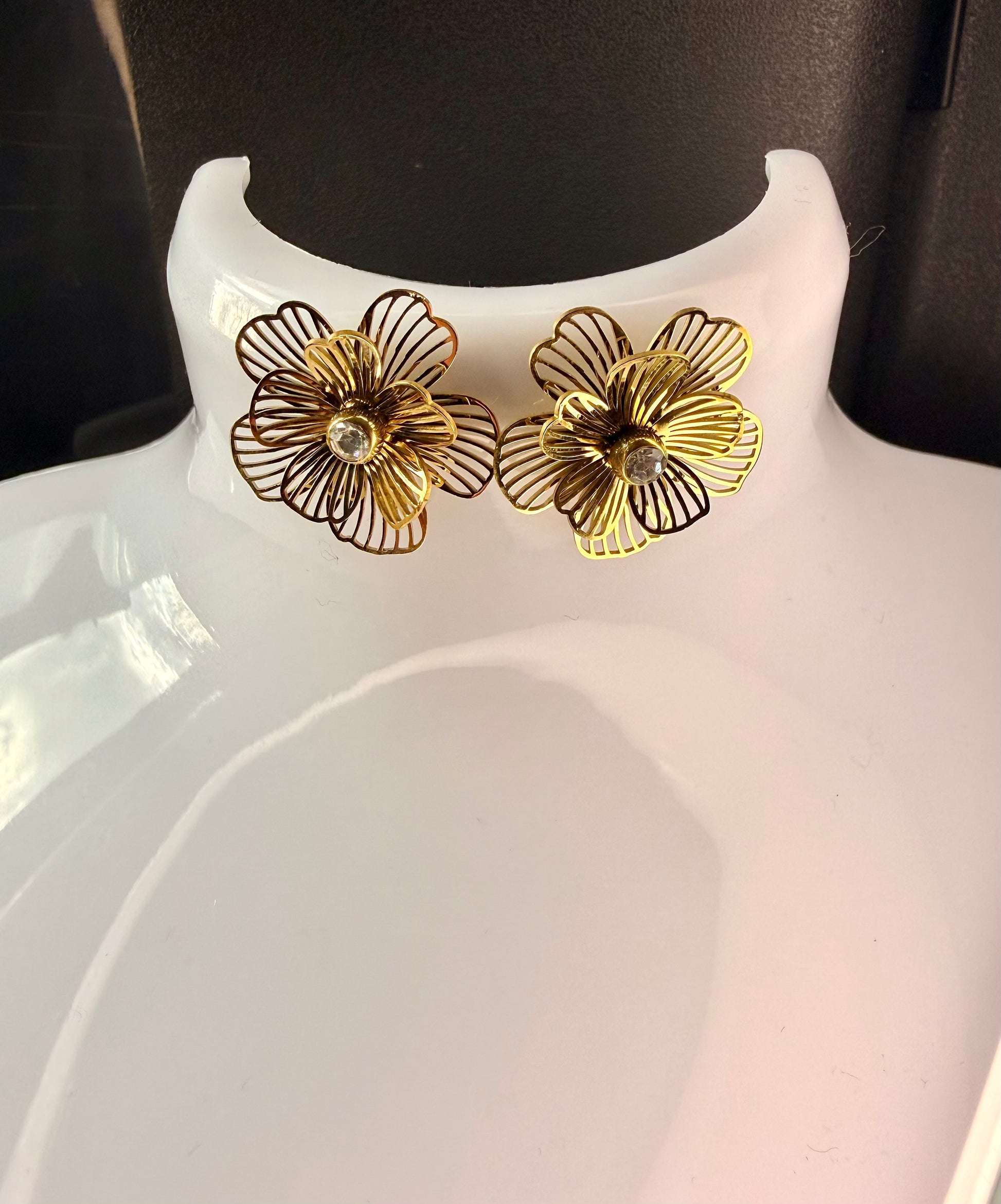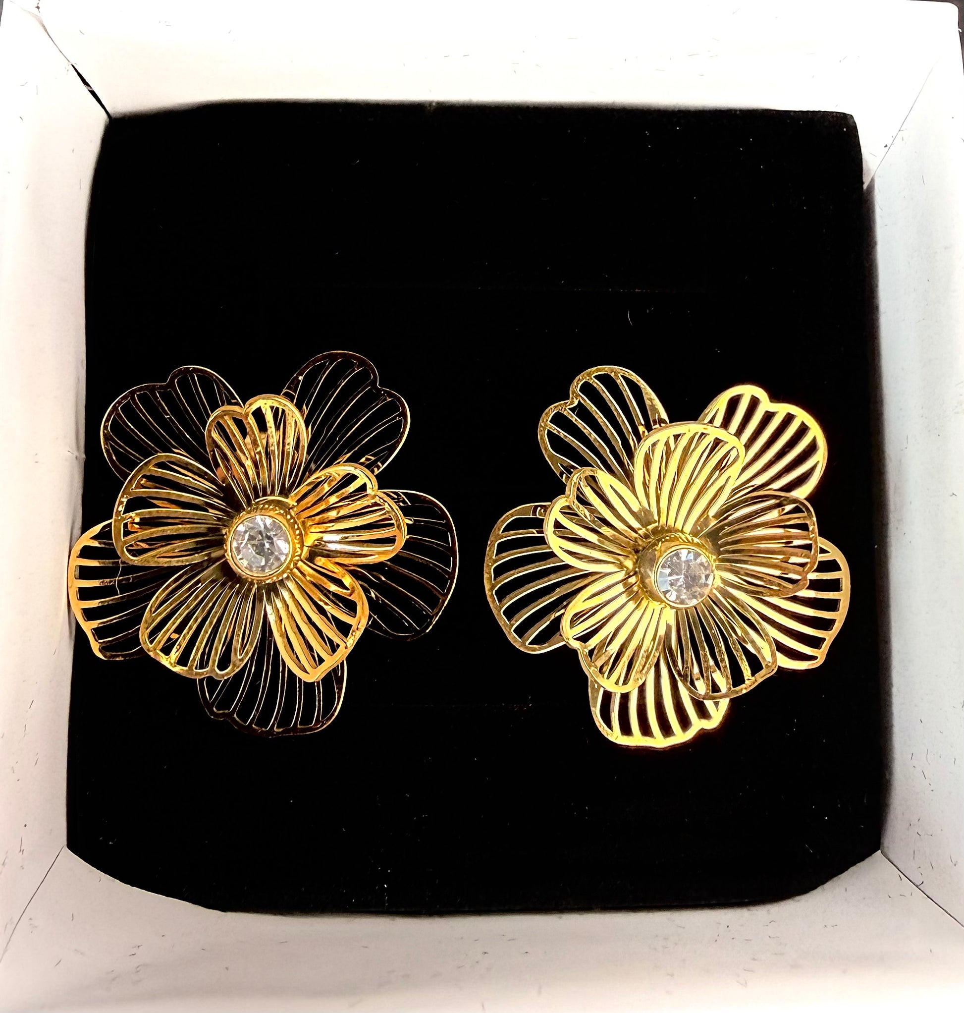 Boucles d’oreilles en acier inoxydable de couleur doré, en fleurs 3D raffinées avec cinq pétales en dessous et cinq pétales au dessus, sublimées par un diamant.