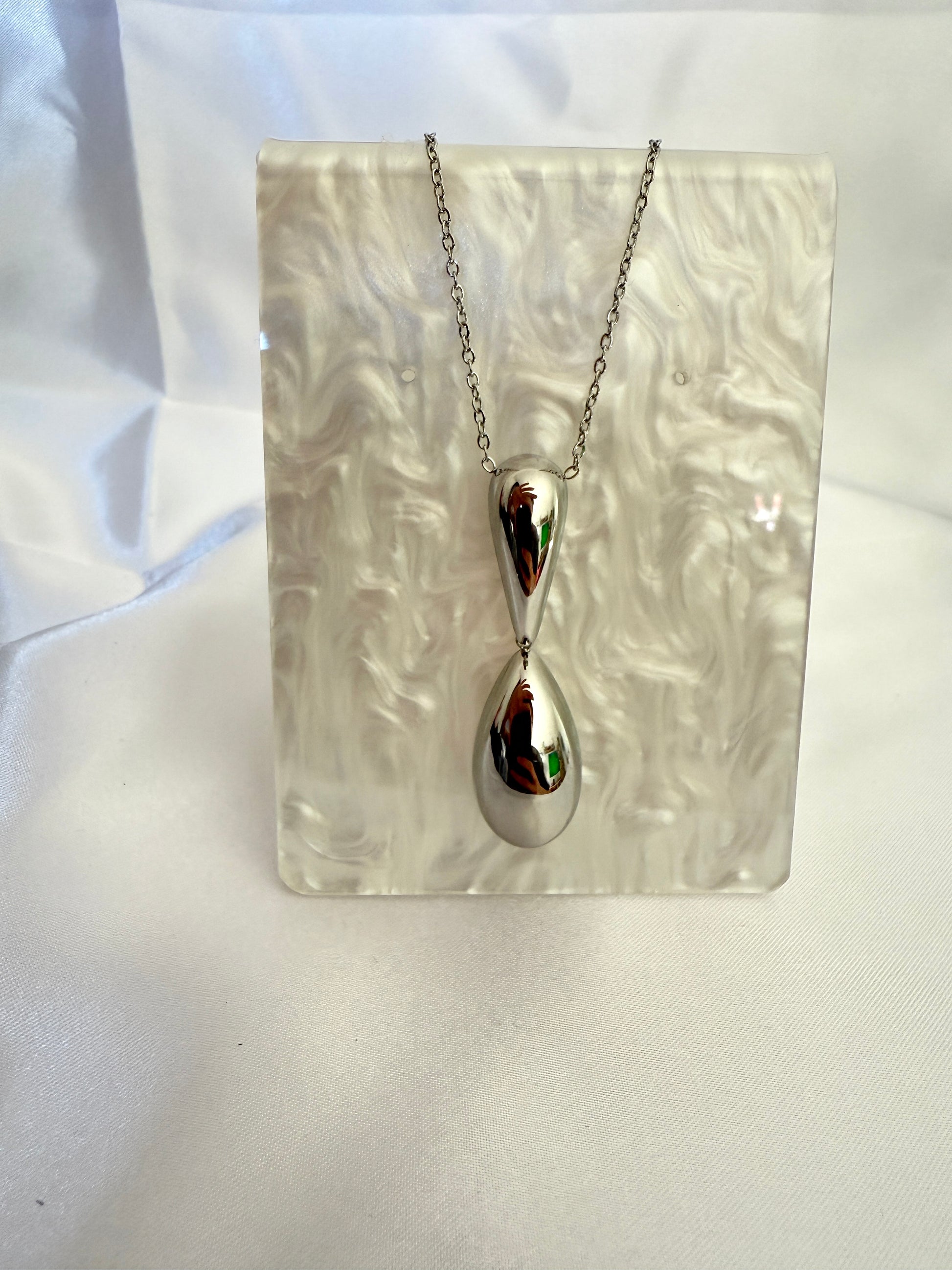 Pendentif argenté en forme de goutte avec un cristal suspendu, symbole de douceur et d’équilibre.