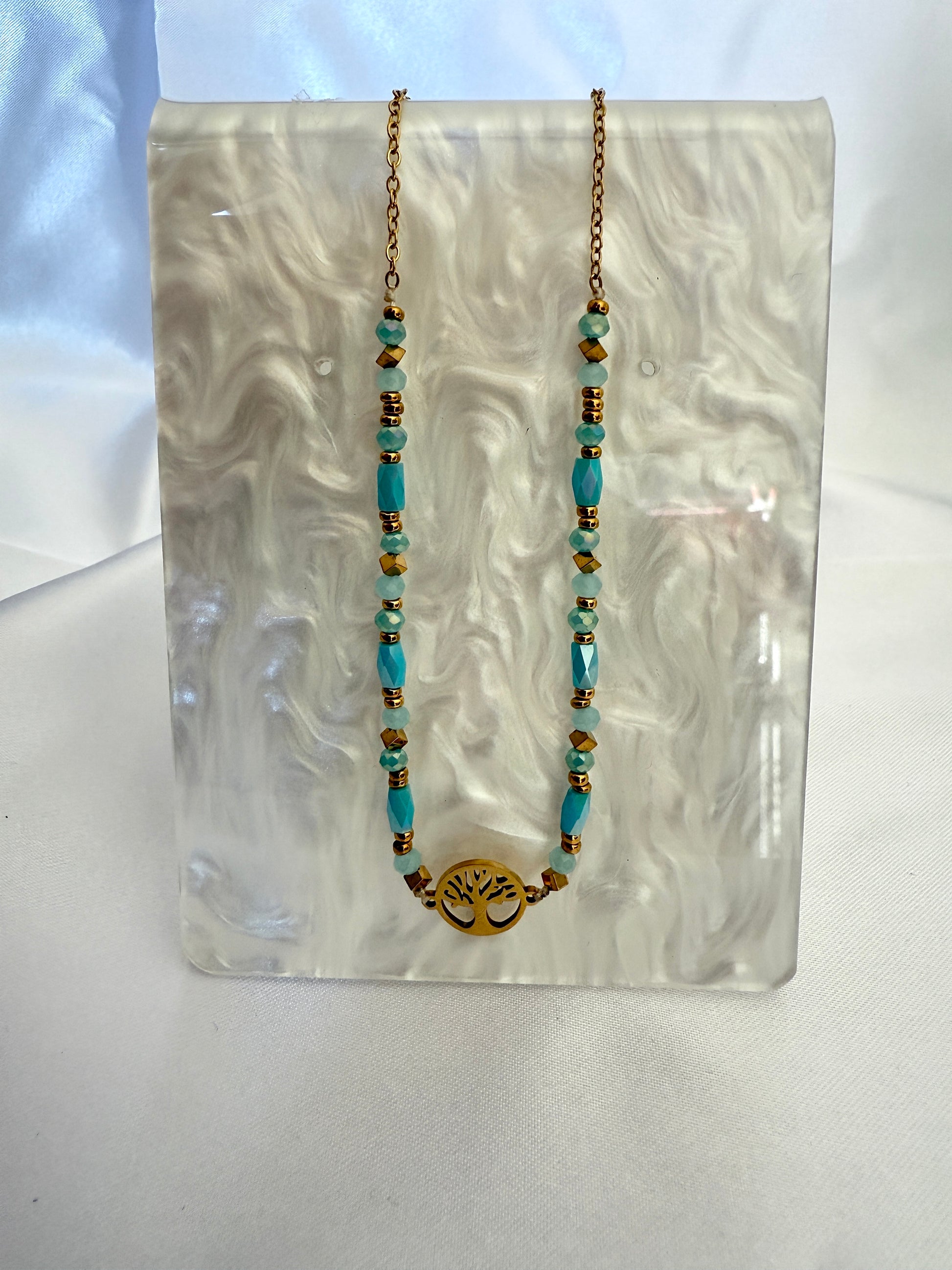 Chaîne orné de perles bleues et dorées, rappelant la mer et ses nuances.