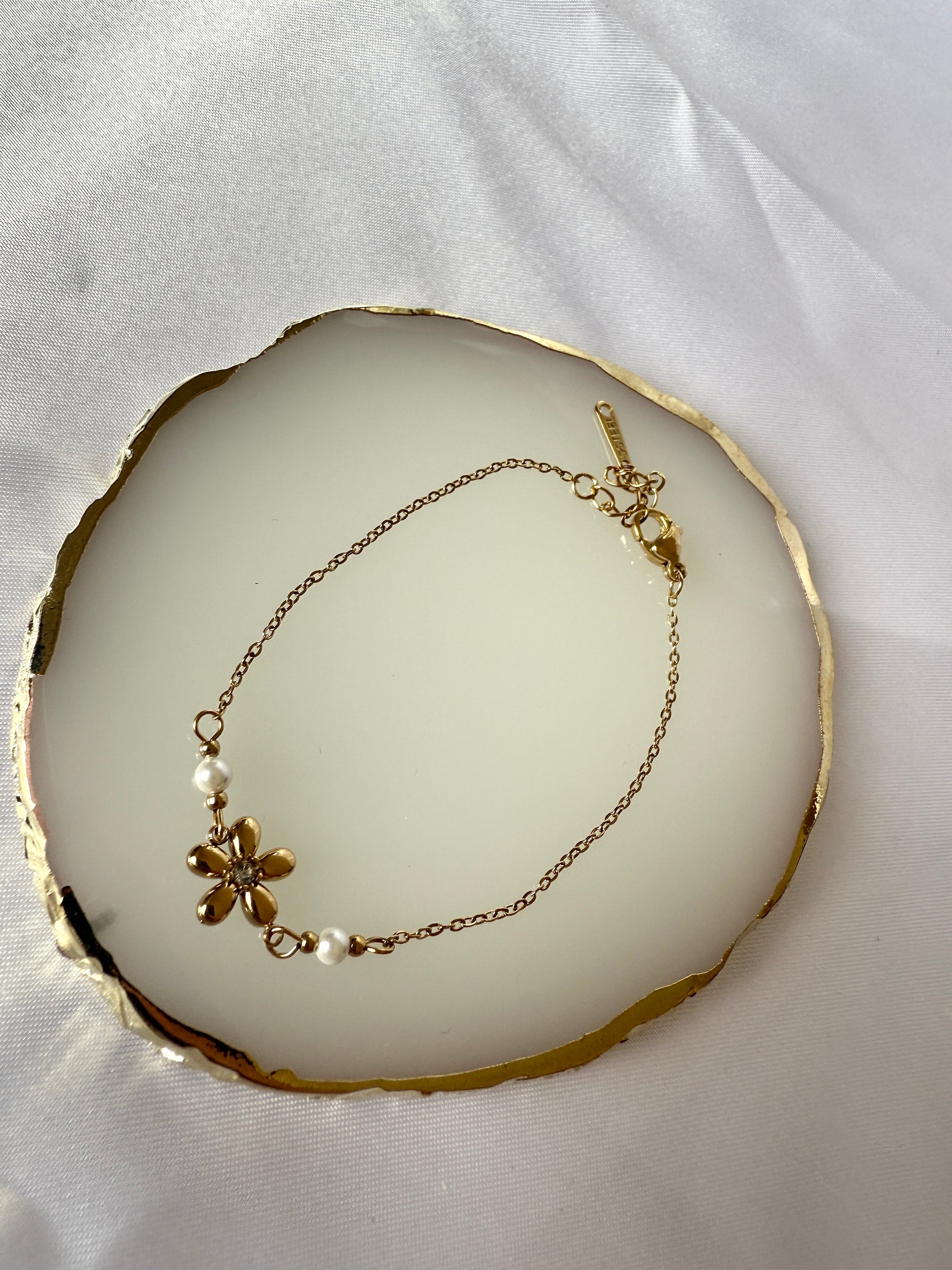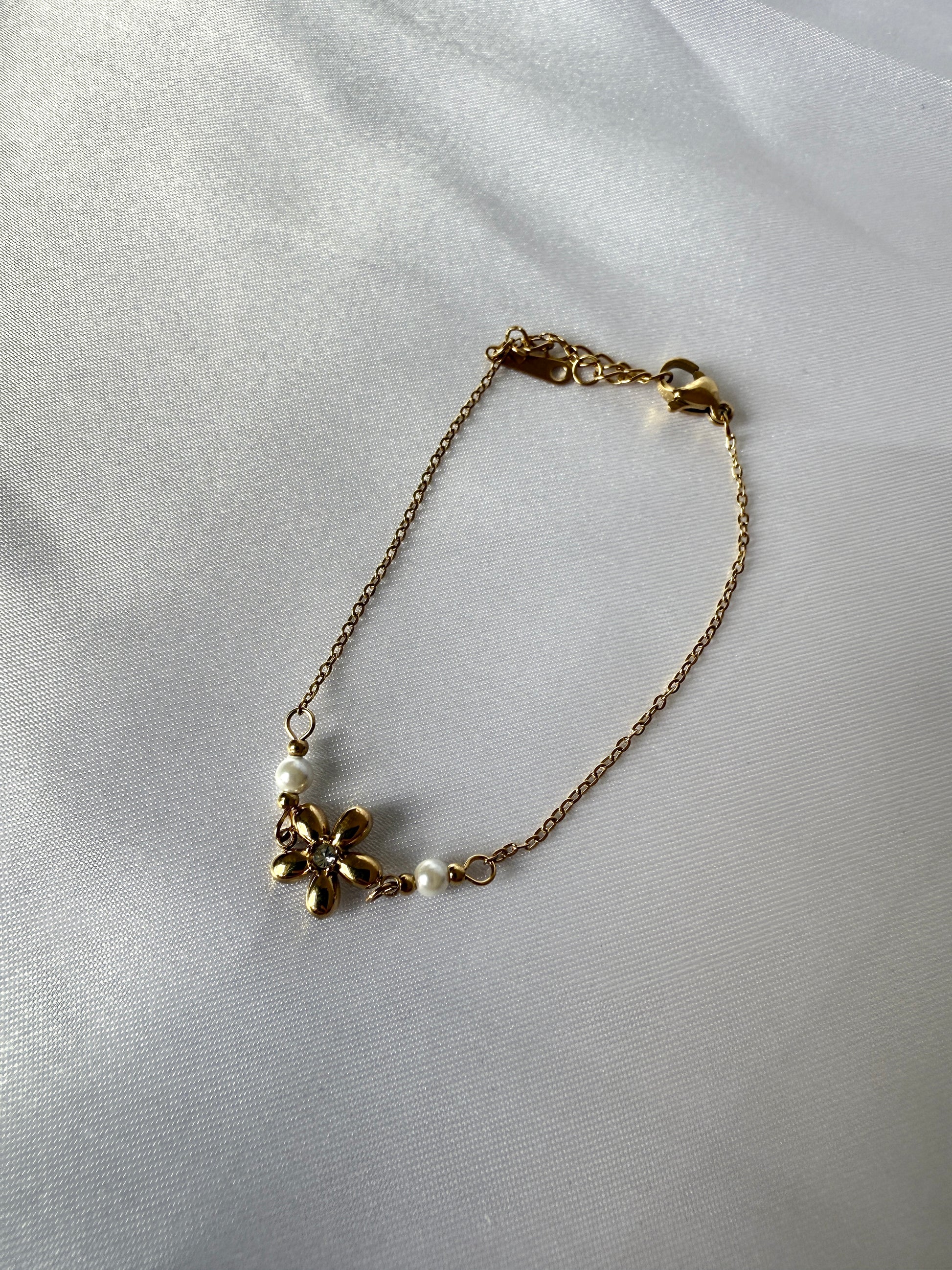 Bracelet en acier inoxydable de couleur doré, délicatement orné d’une fleur élégante et accompagné de deux petites perles blanches sur le côté. Ce bijou raffiné allie douceur florale et touches lumineuses