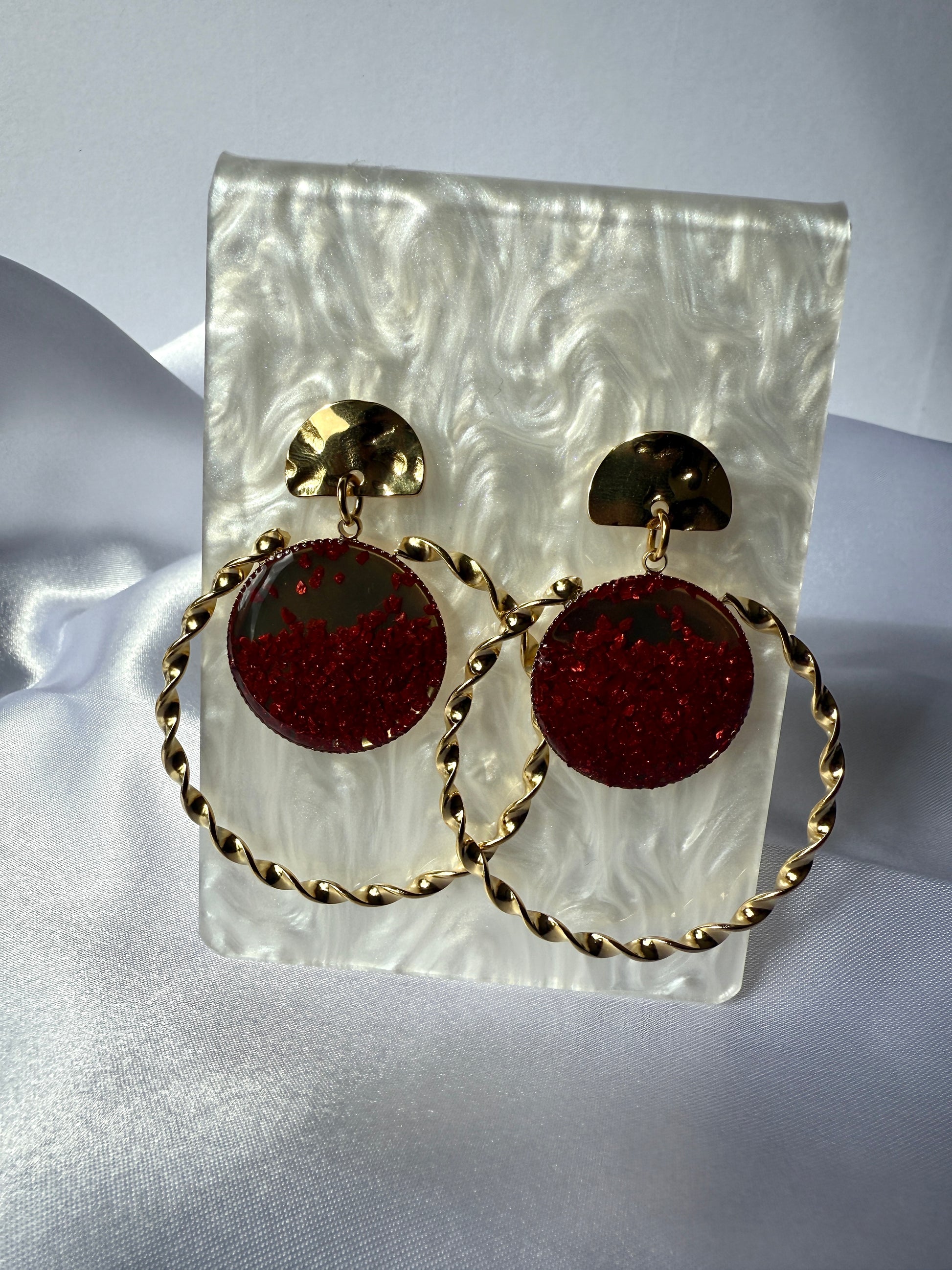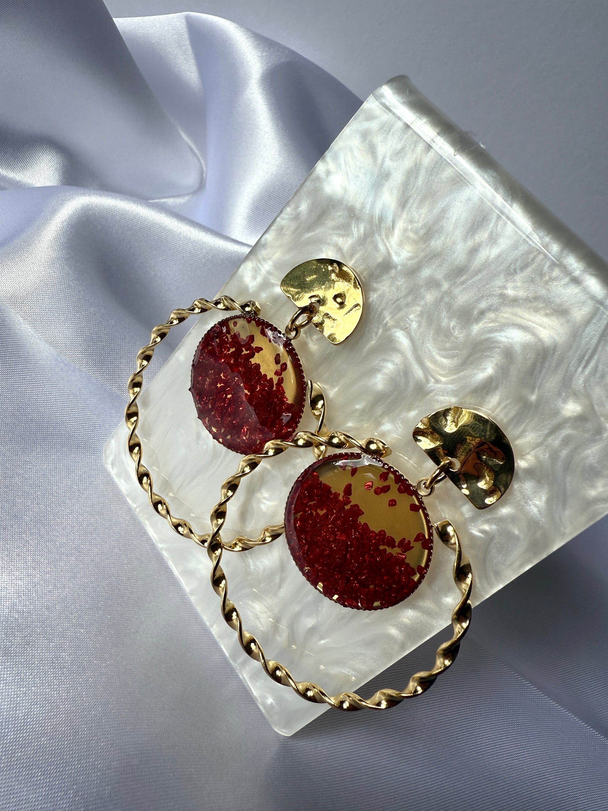 Boucles pendantes dorées avec anneaux martelés et médaillons rouges. Parfaites pour une touche audacieuse.