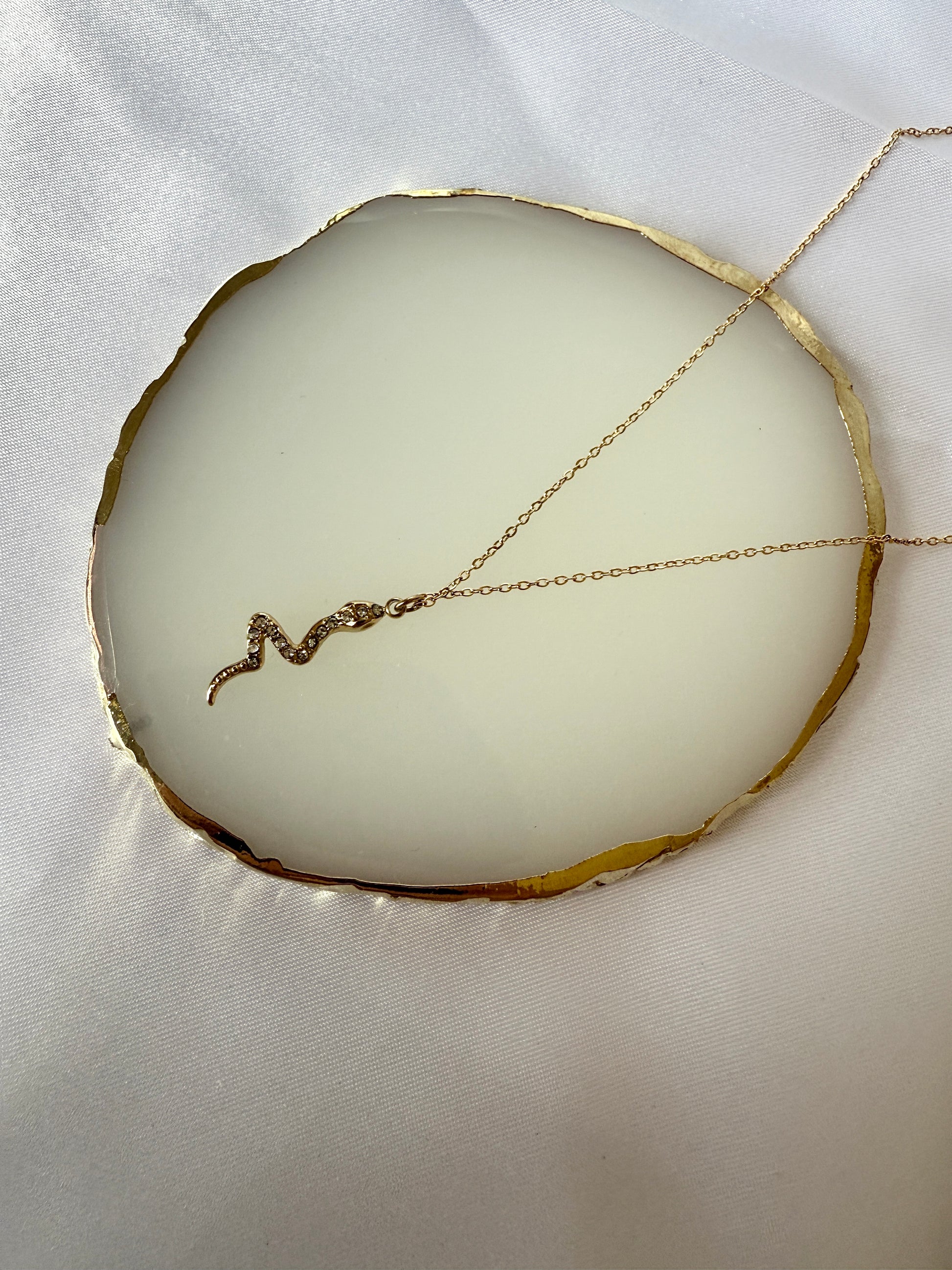 Collier en acier inoxydable de couleur doré, orné d’un pendentif serpent finement travaillé et rehaussé de strass scintillants. Symbole de puissance et de renouveau.