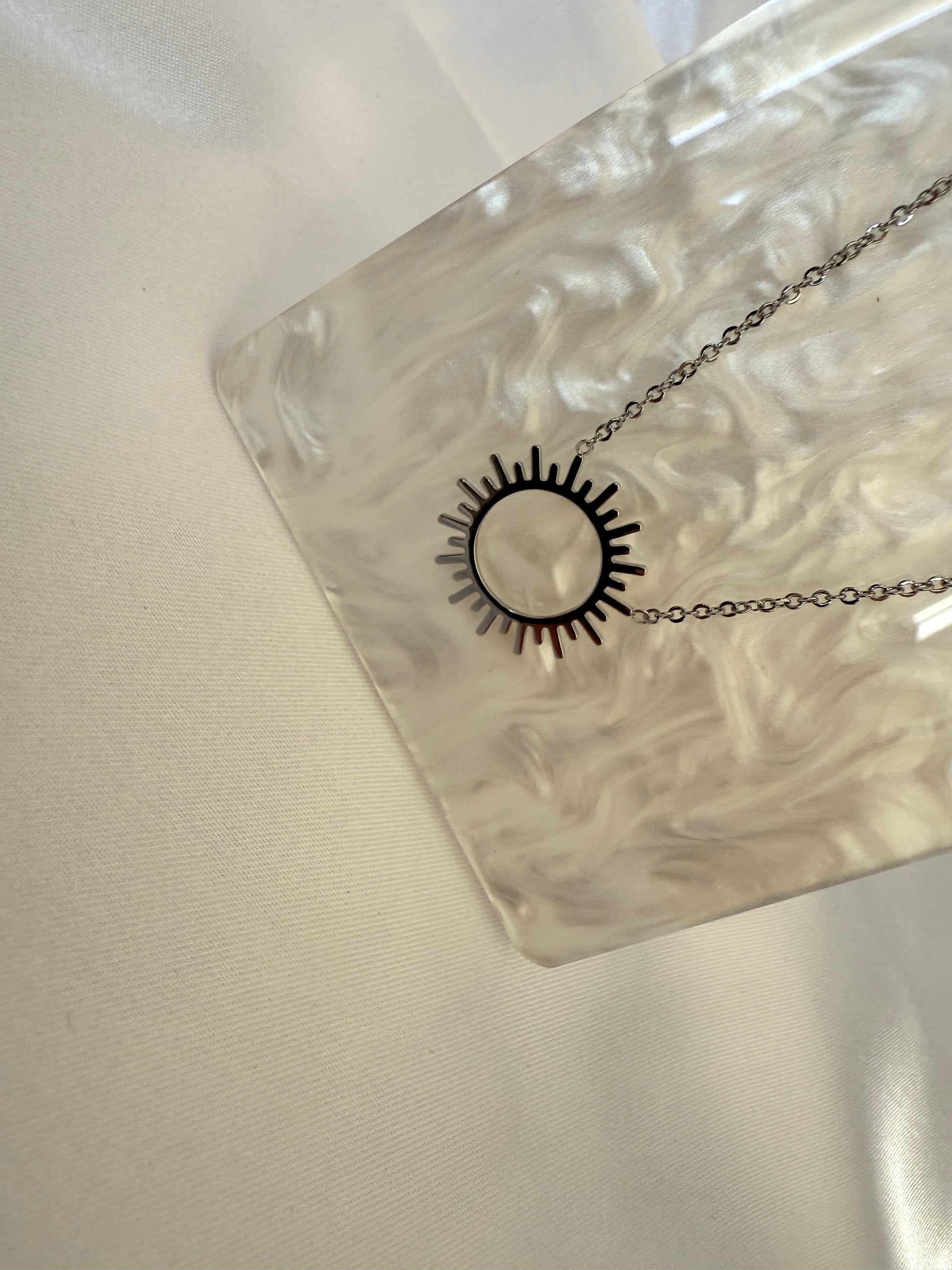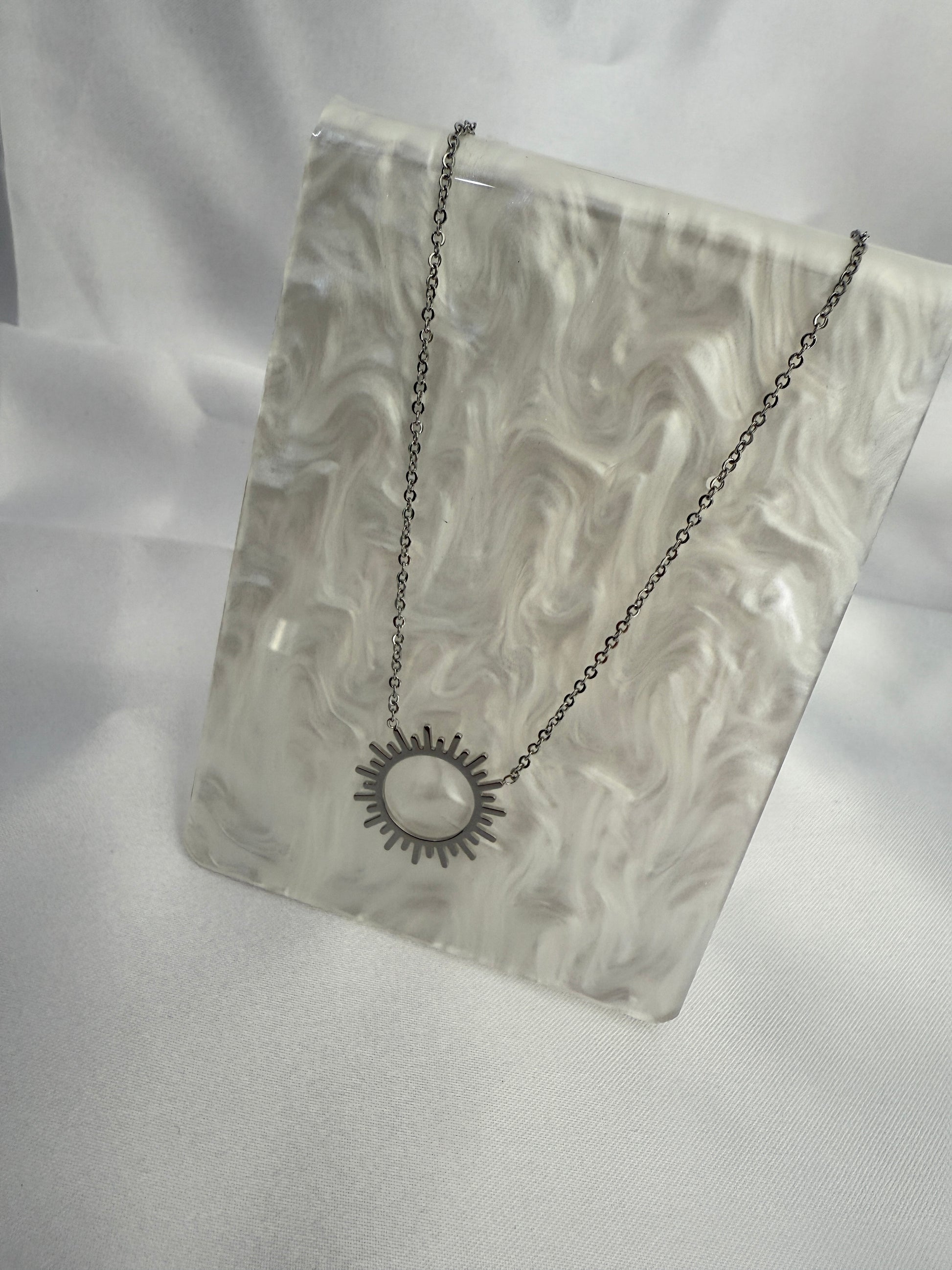 Collier argenté avec pendentif en forme de soleil ajouré, rayonnant et moderne.