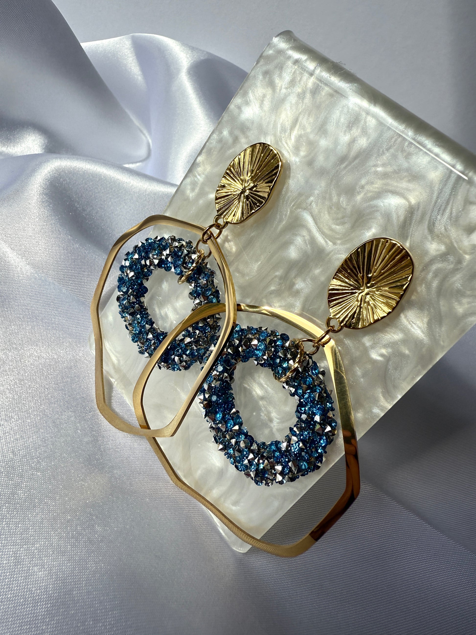 Boucles dorées texturées avec cercle bleues foncées. Élégance solaire avec une touche de profondeur.