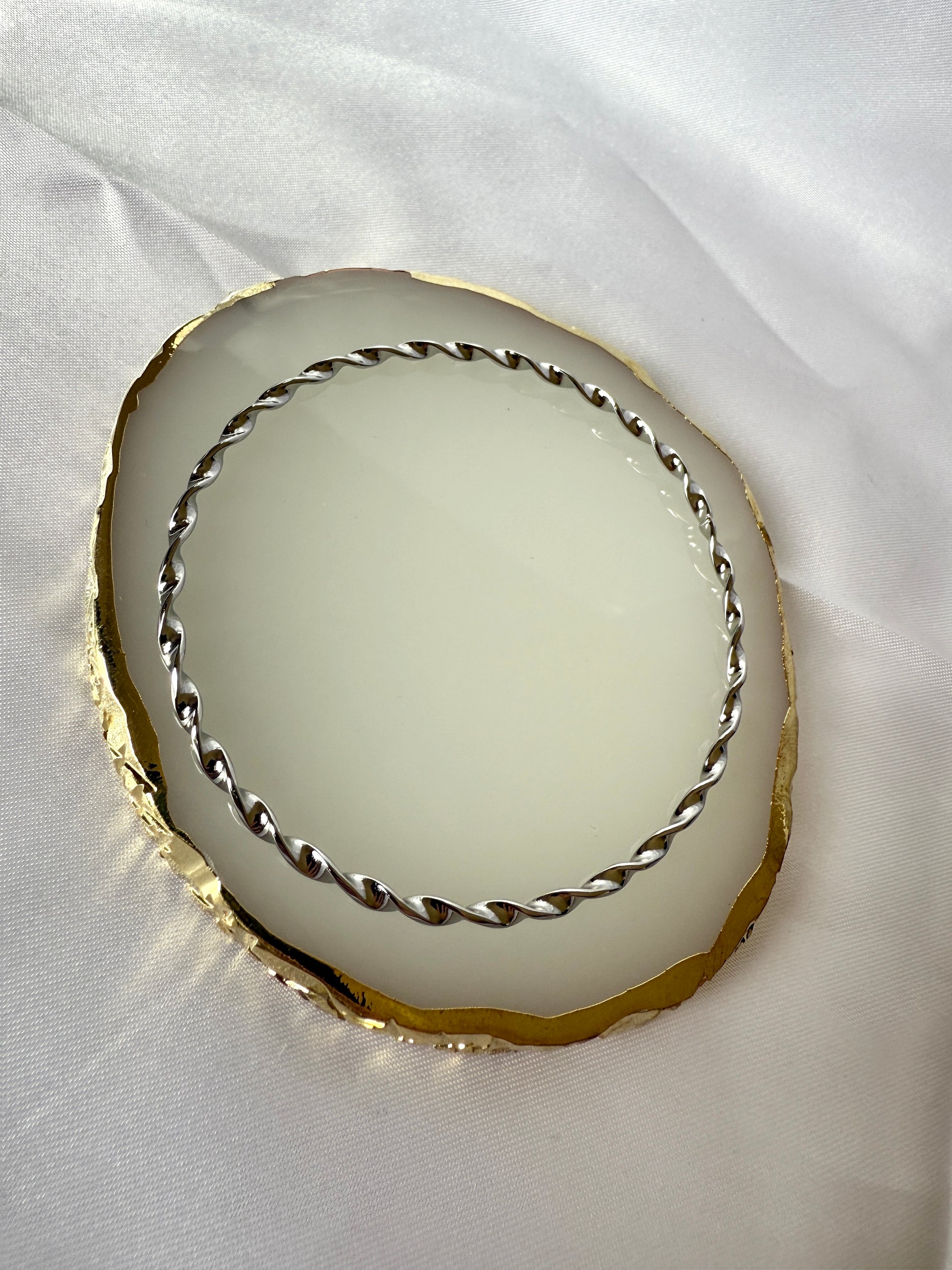 Bracelet rond et fermé en acier inoxydable de couleur argenté, au design torsadé raffiné. Facile à enfiler par la main.