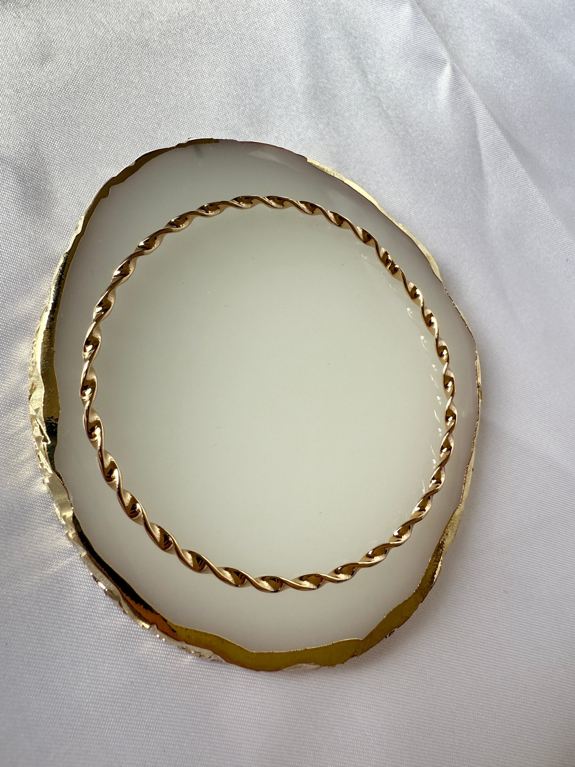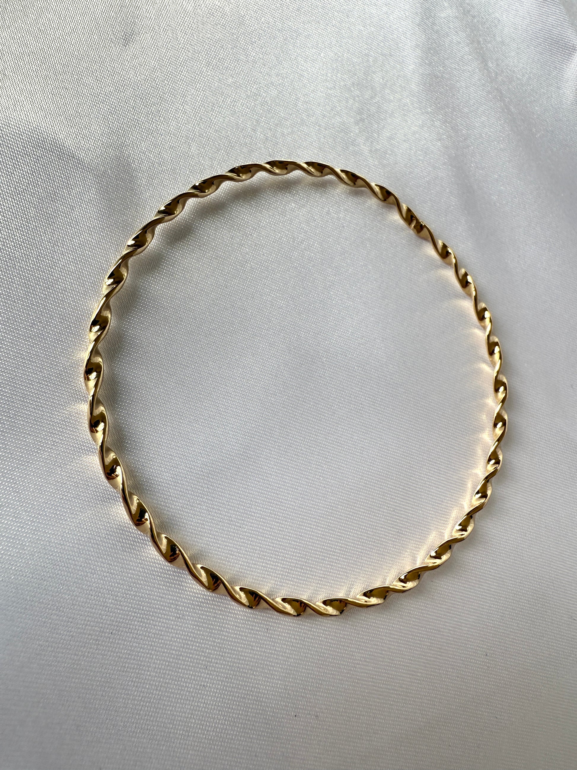 Bracelet rond et fermé en acier inoxydable de couleur doré, au design torsadé élégant. Facile à enfiler par la main.